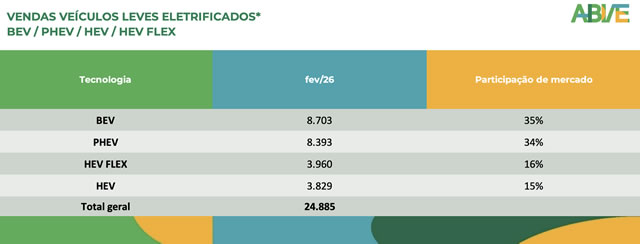 Já os híbridos sem recarga externa (HEV e HEV Flex) totalizaram 7.789 unidades em fevereiro, o que representa 31% do total de eletrificados do mês. Os HEV foram responsáveis por 15% do total (3.829 unidades), e os HEV Flex por 16% (3.960).