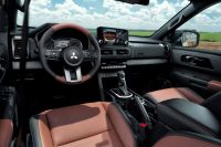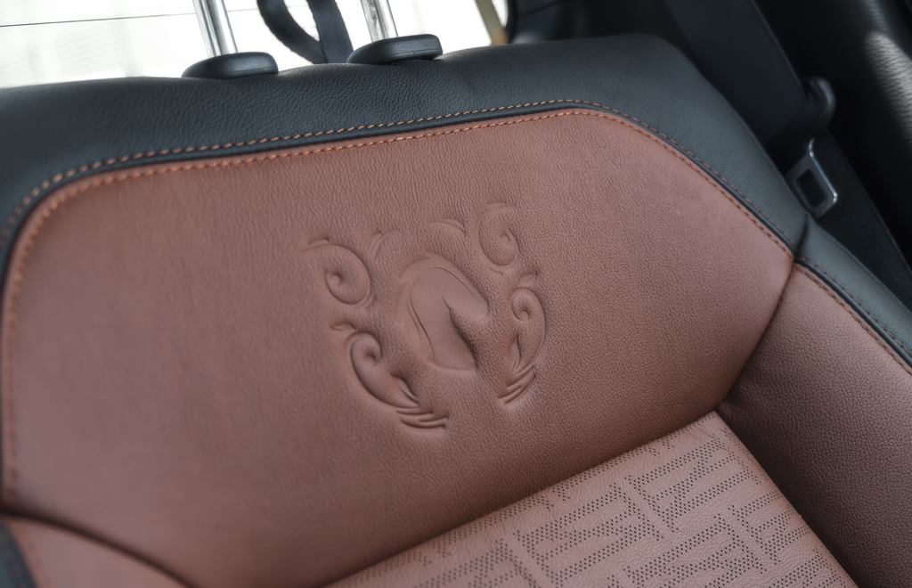 O interior da Triton Sport Terra foi desenhado para remeter à vida no campo em todos os detalhes. A começar pelos bancos revestidos em couro de duas tonalidades: preto e marrom, que trazem brasões gravados no encosto. Eles também contam com ajuste elétrico para o motorista.