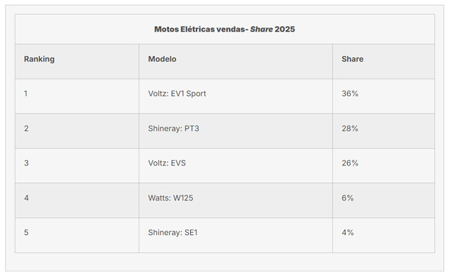 Na sequência, a Shineray PT3 manteve relevância, com 28% de participação, enquanto a Voltz EVS, também da marca Voltz, respondeu por 26% do mercado. Já os modelos Watts W125 e Shineray SE1 registraram, respectivamente, 6% e 4% de participação no mercado.